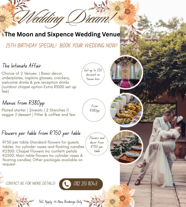 The Moon and Sixpence is a stunning country wedding, conference and function venue. We specialise in hosting exquisite weddings as well as private and corporate events. We also offer luxurious 4-star accommodation on-site.